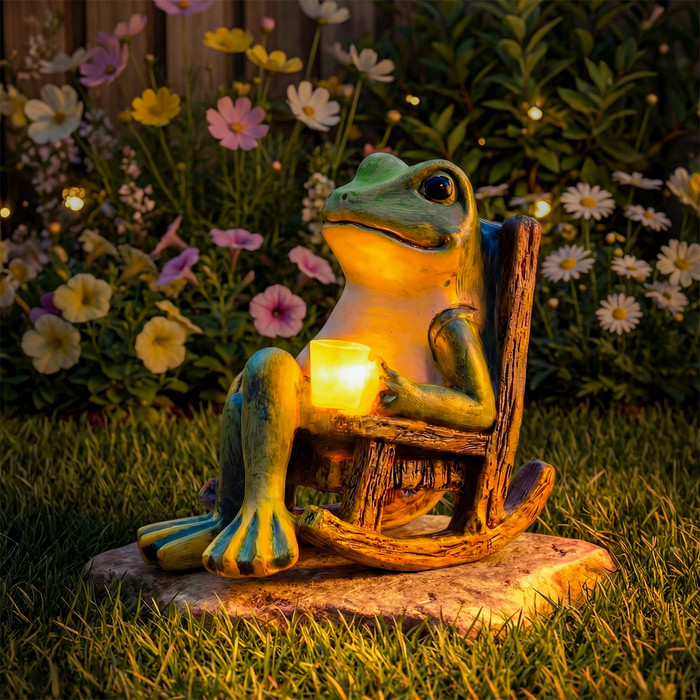 The Glowing Garden Frog glows from its illuminated cup, bringing a touch of fairytale wonder to outdoor spaces. It casts a soft radiance that gently transforms evenings into magical, storybook moments.